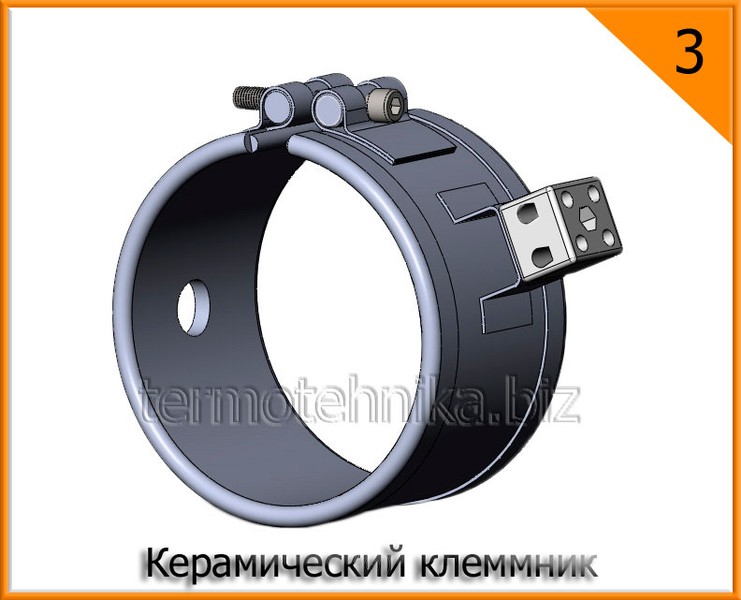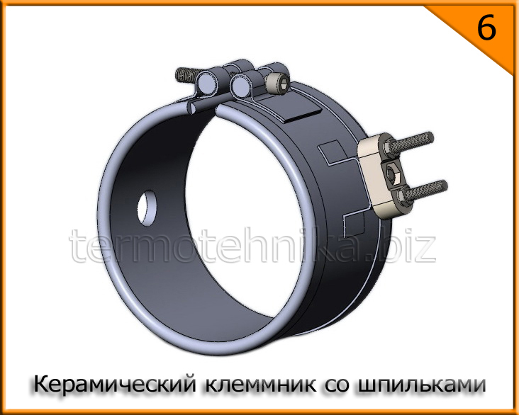 Керамические хомутовые нагреватели (их еще называют манжетными или кольцевыми нагревателями) – это резистивные электронагреватели основной особенностью которых является то, что резистивная проволока размещена внутри керамических косточек. За счет данной конструктивной особенности, максимальная температура нагревателя может достигать 700°С. Керамические хомутовые нагреватели используются для нагрева цилиндров термопластавтоматов , литьевых машин, экструдеров, обогрева прессформ.